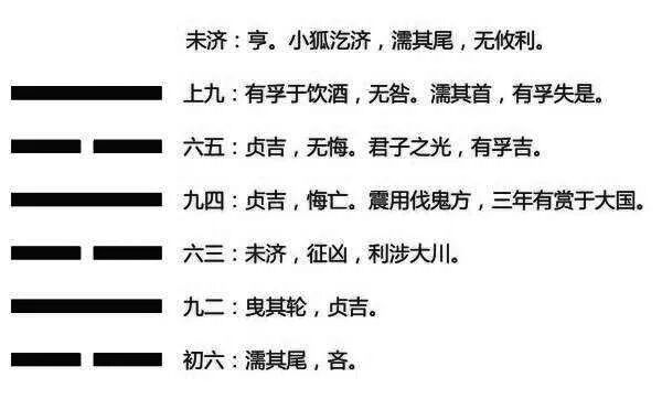 卦的六爻,阴居阳位,阳居阴位,刚柔皆不当位,违反了正的原则,象征正常的秩序受到了破坏,所以称之为未济,意思是所有的事情都没有成功。虽然如此,成功的可能性仍然是存在的,根据在于未济卦中的刚柔都能互相应和,各自按照中道的原则进行合理的调整。