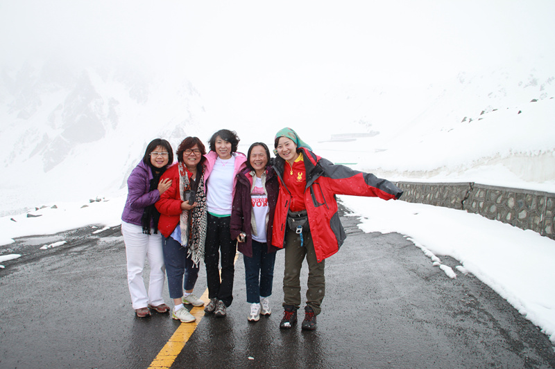沿着重峦叠嶂、气势雄伟的天山山脉北麓,我们穿越独库公路,开了近十个小时的车,路况很不好,一路下着小雨,个别路段还有泥石流和塌方。好在有惊无险,也正因为如此,我们才领略了六月飞雪,台湾的三位姐姐高兴坏了,她们还没见过雪呢!一路上,两旁的景致从农田到荒漠再到森林,从夏到秋再到冬!翻山越岭,每翻过一座山,就可以看见绿油油的草原和零散民居,游牧民就在大草原或山坡上搭起一个个帐篷,一个帐篷就是一个家,牧民一家放牧着牛羊马,全家一年的生活就靠它们了。