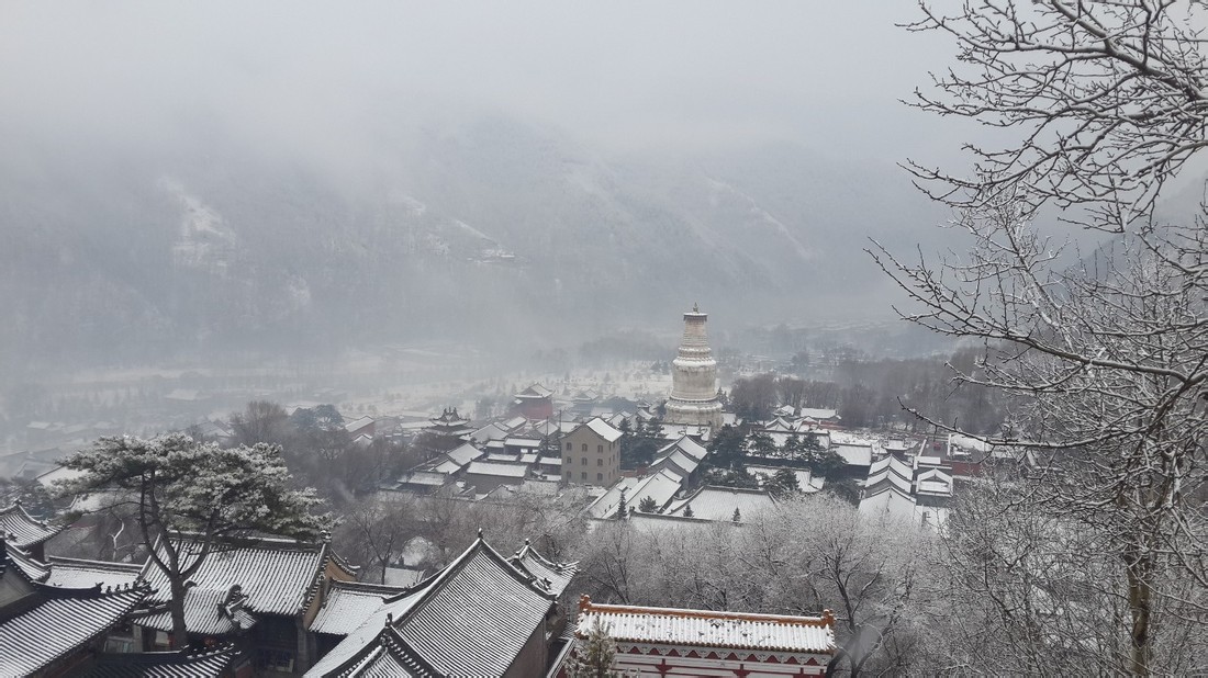 从菩萨顶拾级而下远眺俯瞰时,已是一派迷蒙虚幻的美景,四周山峦在云雾白雪中若隐若现,大白塔屹立其间,白雪覆盖下的青瓦黄琉璃层层叠叠,红底墙上大大的“佛”字赫然可见。圣境仙境般让我们心境更加清静素洁。